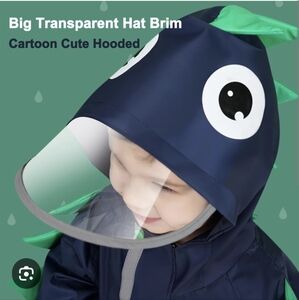 Adorable navy rain suit with dinosaur spikes. Features green accents and fun dinosaur design. Waterproof with elastic cuffs and adjustable snaps.