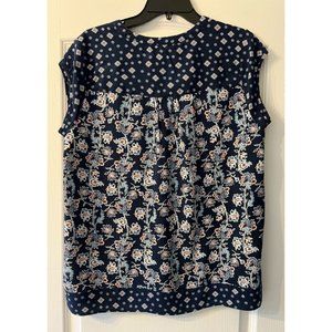 Navy short sleeve blouse with peach, light blue and white floral design. Contrasting front and back yoke, sleeves and hemline.