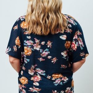 Love this navy waffle floral print knit top! It features a v-neck, short kimono/dolman style sleeves, wood buttons, front knot, relaxed fit, and a loose, soft, comfortable material.