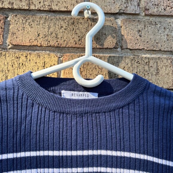 Trendy ribbed knit sweater by Revamped featuring navy and white stripes with bold green side panels. Slim, cropped fit with long sleeves. A statement knit for layering or pairing with denim.