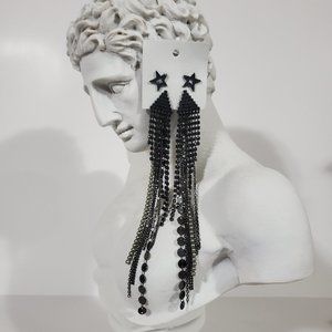 Navy rhinestones, gunmetal coloring with pearl imitation beading and chain dangles. Multiple pairing choices with star studs pairing, shorter dangles pair , normal backings pair and long chain dangle backings pair).
