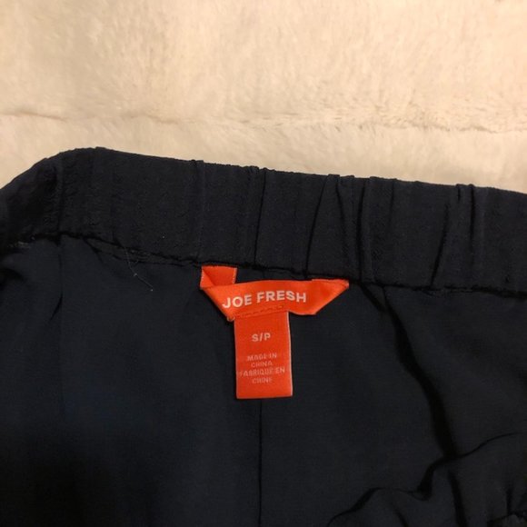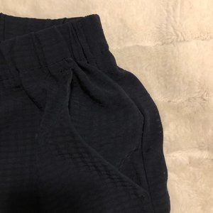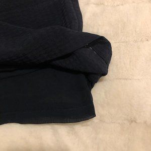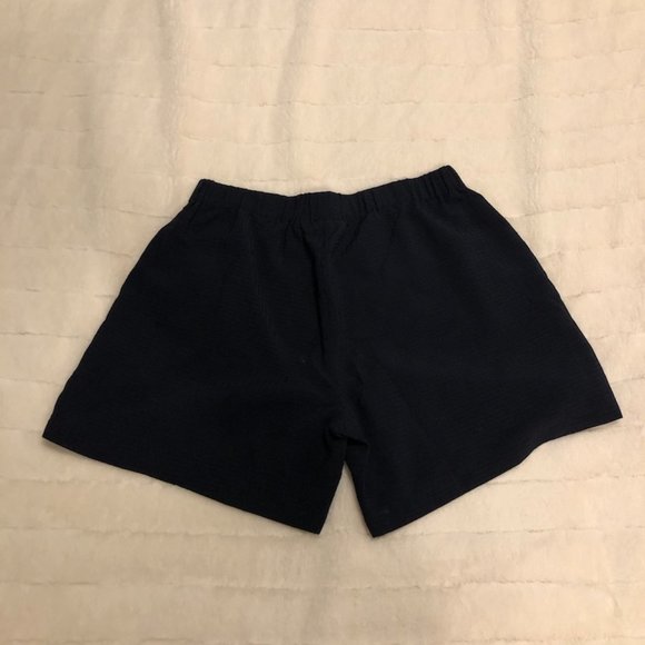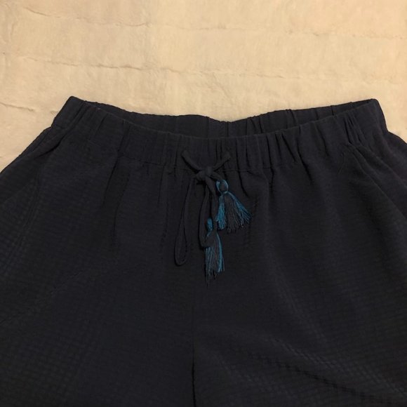 Navy high wasted shorts with a fringe tie in front, loose fit and textured look. Includes pockets.