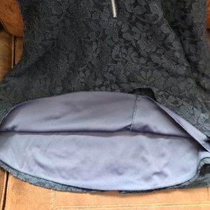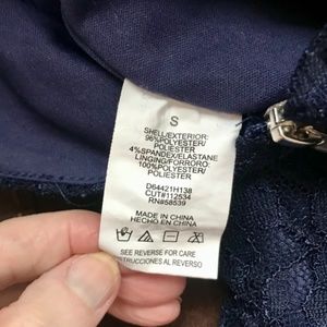 Navy Lace Sleeveless Dress: V Neckline , V back with zipper, above the knee. Completely lined . Poly /Spandex. Slightly A-Line . Extremely comfortable . Perfect cocktail dress all seasons . Size small