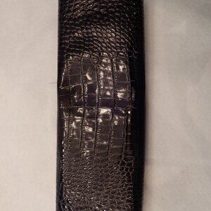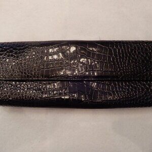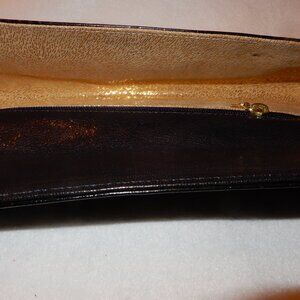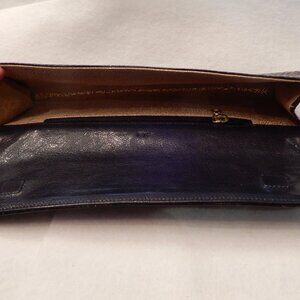 This is a new, never used, old stock glossy navy alligator embossed leather clutch purse. It has a metallic gold leather interior with an inner zipped pocket for valuables. The zipper handle has made a tiny micro dent in the liner but the purse is in otherwise pristine mint new-from-the-store condition. It's flap closes securely when it's 2 sewn in flap magnets kiss the other 2 sewn in purse magnets. It measures 10.5 inches long by 4 inches high by 1 inch wide and can be easily carried in one hand for a dressed up or even more casual look with jeans. It will come with a flannel Brooks Brothers dust bag.