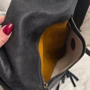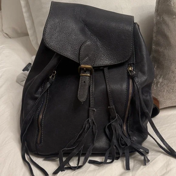 Stylish black leather backpack with tassel details. Perfect for everyday use.