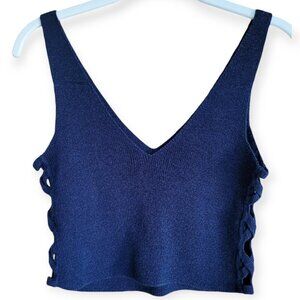 The Intermix Annie tank features a navy linen-blend knit with a crisscross lattice design and cropped hem. It's perfect for layering or wearing standalone.