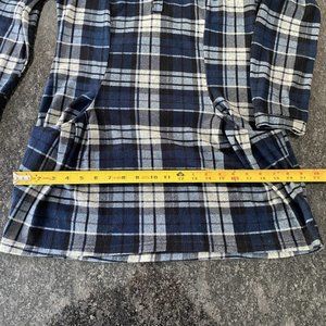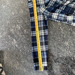 This is a cute Navy Plaid tunic/sweater. It has no tags on it for size or material. I am a medium and it fits great. This is very soft and depending on your height goes past the bum ;) it ha 2 front pockets small button up and collar. I believe the brand of this is Papillon because I have seen them sell this before. Overall in great shape and has alot of life left to give. It is cute with leggings too because of the length. See picture for all measurements.