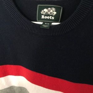Bought this Navy roots sweater that has red and white stripe across. It actually from the men’s section and is a M but i would say it fits women’s S/M for an oversized look. Not worn very much, good quality and no flaws