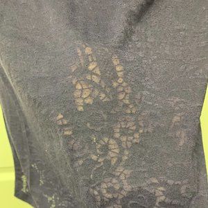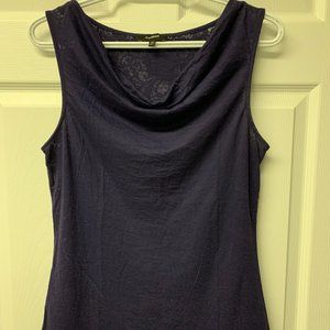 Very cute with some parts transparent on the design (picture has my hand under the fabric). Long in length, sleeveless, thick straps with draped round neck in the front and high on the back. The color is the dark navy we all love!! Wear it in summer or spring under a cardigan!!