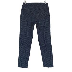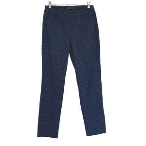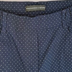 Slim, flattering pants from European brand Stark in stretchy navy fabric with a subtle white dot print. Easy to style for work or casual looks.