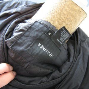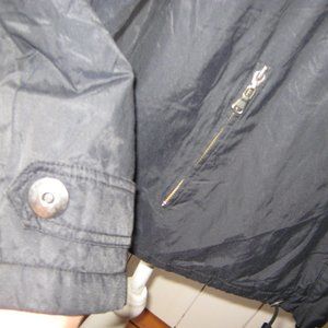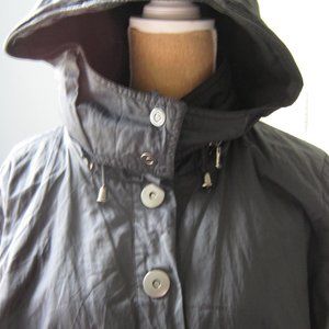Front zip hip pockets, pull ties around the hood, snap accents on the sleeve cuffs.