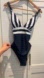 Navy Stripe V Neck Ruching Tummy Control One-Piece Swimsuit Size L NEW