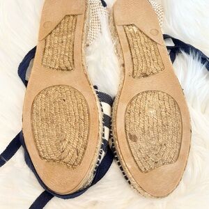 Elevate your casual look with these stylish navy striped espadrilles. Featuring a comfortable lace-up design, they are perfect for any outing.