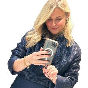 Features a rich blue-gray leather body with subtle texture and contrast paneling for added dimension. Soft, broken-in leather with a structured yet relaxed drape. Cropping was professionally done to refresh the fit while preserving the original character of the jacket.
