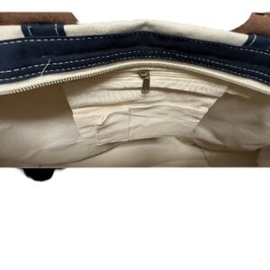This natural canvas body bag features a gorgeous blue contrasting trim, faux leather accents, and antique brass hardware. Purchased but never used.