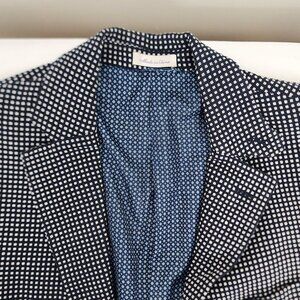 mens blazer, navy jacket, white check, wool blazer, long fit, gingham pattern, two button, notch lapel, formal wear, casual blazer, mens fashion, Satin Lined, Cotton Blazer, Dress Coat