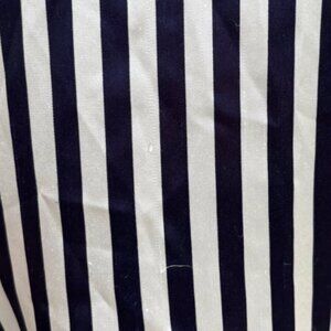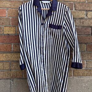 Vintage St. Michael navy and white vertical striped longline shirt dress. Features button-down front, chest pocket, and contrast navy collar and cuffs. Timeless. A bit of wear on the side, see photo.