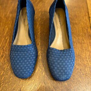 Navy blue shoe with woven upper and small wedge heel. Great with dresses or pants. Worn only once so new condition A fairly narrow fit, although I do not take a narrow and they fit me.. Leather back strip and inner sole. Very classy shoe.