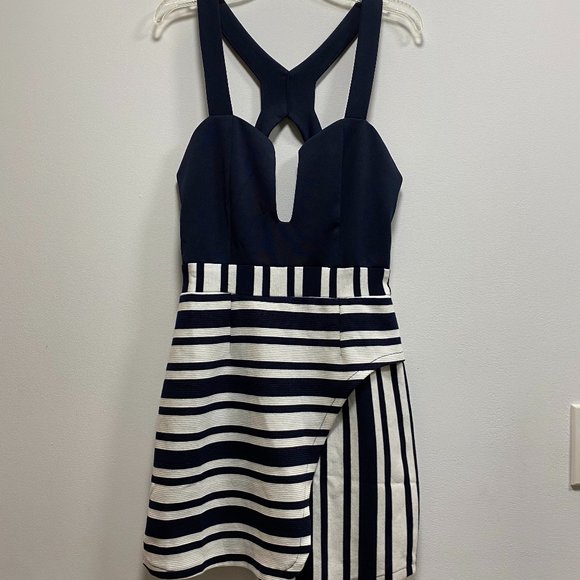 This is a light and stretchy navy blue and white mini dress with a zipper closure at the back. The hem is asymmetrical at the front (as you can see in the pictures). Size small. Never been worn.