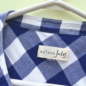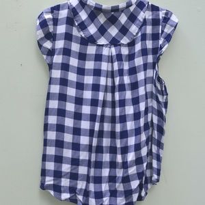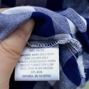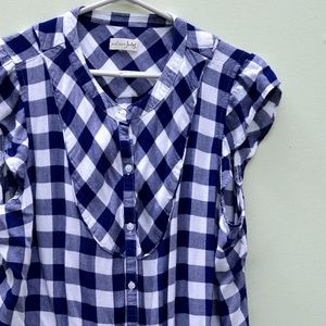 Very pretty gingham summer top. Great navy and white hue. Features sweet ruffled flutter cap sleeves and yoke detail. Button down.