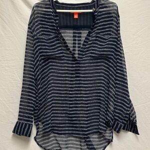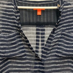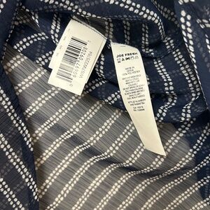 Classic navy blouse with white polka dots, perfect for adding a timeless pattern to your wardrobe. Lightweight fabric with a flattering fit and button-up front. Great for work or casual occasions. Gently worn and in excellent condition.