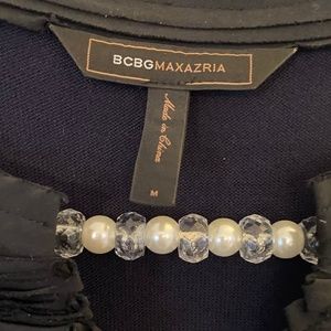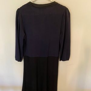 Lovely black and navy long sleeve knit BCBGMaxAzria dress with front ruffle and small black shiny buttons and knit belt.