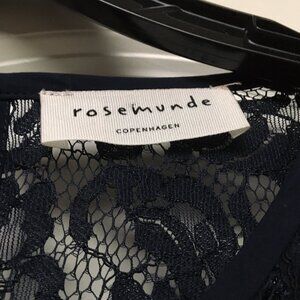 Navy & black guipure lace dress by Rosemunde Copenhagen, size DK 36 (US 6). Round neck, full sleeves, lined from chest down. Sleeves and hem are finished with black scalloped lace. Chest (flat) 45 cm, length 101.5 cm. The dress has stretch to it: 95% polyester, 5% spandex. worn twice, in great condition.