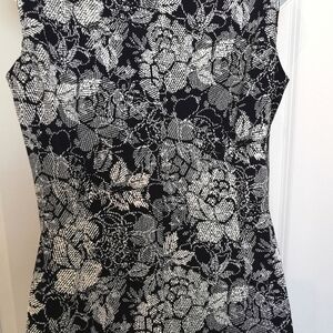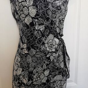 Figure-flattering jersey dress featuring a faux wrap with a side tie. The dress has white flowers on a navy blue background.