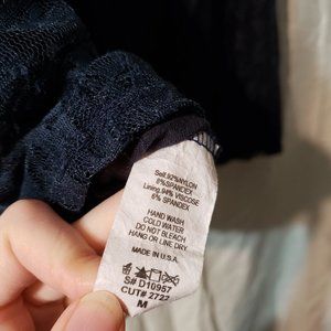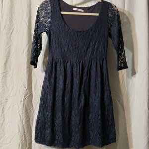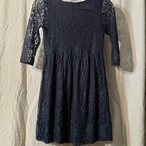Cute dress in a soft and stretchy navy lace. The bodice and skirt are lined in a jersey knit material, and the sleeves are unlined to show a bit of skin. Flattering scoop front neckline. This can be dressed up or down by pairing it with different accessories.