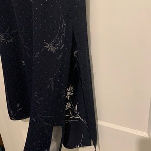Navy blue maxi skirt with floral and polka dot pattern. Has slits up both sides.