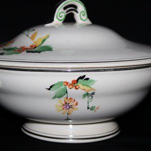 Introduced in 1930 by Homer Laughlin China, the Wells shape was designed for simplicity and elegance. Soprano features a simple yet lovely and colorful floral pattern. The handles and lid knob have striking green striping, with platinum bands. Platinum bands also run along the foot, lid, and both outside and inside rim. For being nearly a century young, the bowl is in very good condition without chips, cracks, flaking, or stains. The black and white Peacock backstamp is a rarity to find as most Wells ceramics have a colored peacock.
