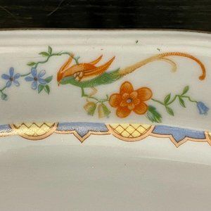 This beautiful bone china serving platter features an elegant and eclectic bird design and pineapple motifs. Made by Gebrüder Benedikt in Czechoslovakia, this particular platter is estimated to be from 1925-1939 based on the backstamp. This platter would make an excellent addition to any fine china dinnerware collection, and is sure to stand out on your table!