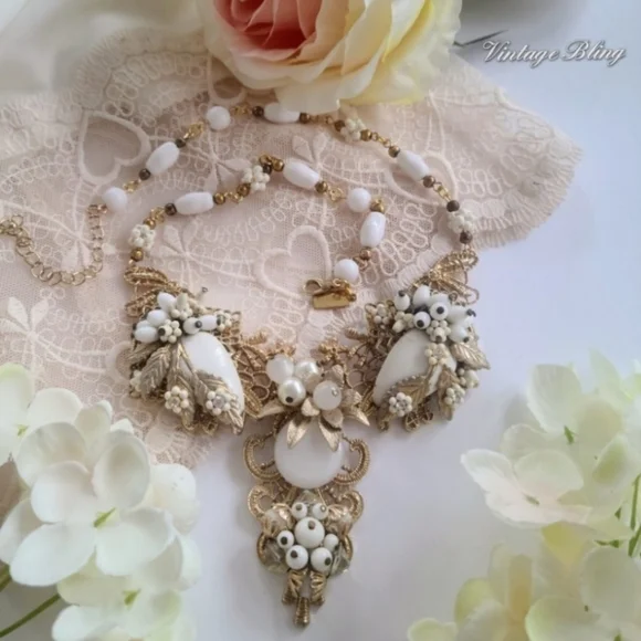 This is a Vintage Bling necklace, handmade by me, using all vintage components. This is a chest piece. The back measurement of beads is 13.5" from each side of filegree base with 3" extension chain at the clasp.
