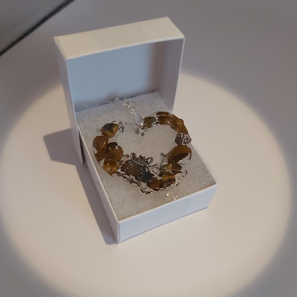 This Necklace has several layers of resin, and many natural Tiger's Eye gems with a 20" Sterling Silver chain