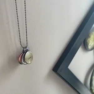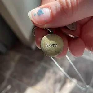 Necklace says dream, inspire, and love on it. Love on one side is kinda tarnished ( see photos)