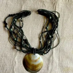 This Boho style necklace is in excellent condition. It’s made with wooden beads and a. Ice shell. Worn once. 17.5 inches long.
