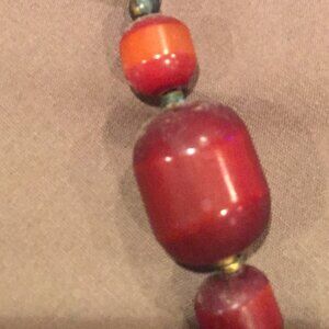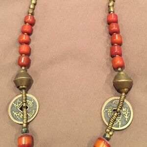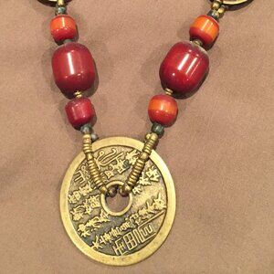 Necklace Antique Amber, Brass and Chinese Village Coin