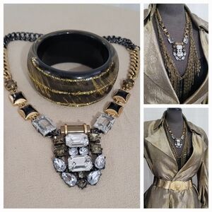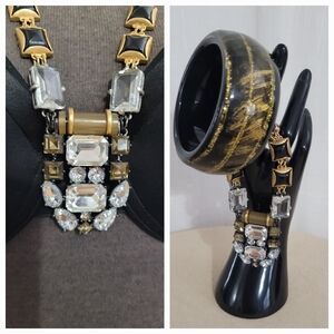 This stunning jewelry set features bold gold and black design with smokey topaz and diamente colored stones to create a STATEMENT piece to wear long with a turtleneck or short with a white t- shirt !