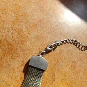 I think I bought this in the 1980's. It's about 15 inches long at the longest. The clasp that does it up works, but the "lever" that makes the clasp open and close is broken. It should be easy to swap out the clasp for a new one. This flaw is reflected in the price.