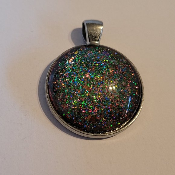 I handcrafted this pendant using a combination of epoxy resin and opal particles and sparkly glitter, It has a captivating sparkle. It has a bezel made from a metal alloy, is antique silver in color and has a glass dome on it. This item is brand new and is located in a non smoking area.