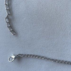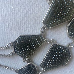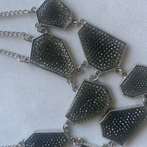 This unique necklace is gunmetal gray (18") chain with geometric shapes, each covered with