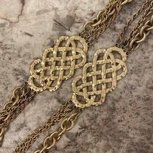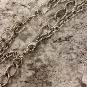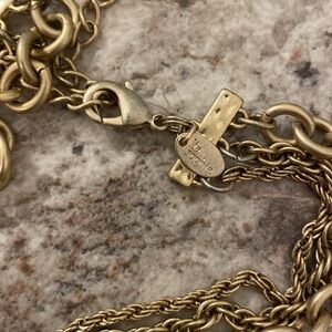 Two Lia Sophia chains Silver chain is 34 inches long. Can remove a part of chain to make chain 26 inches Gold chain is 28 inches