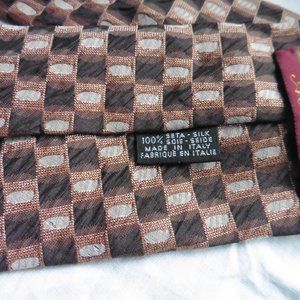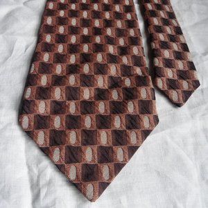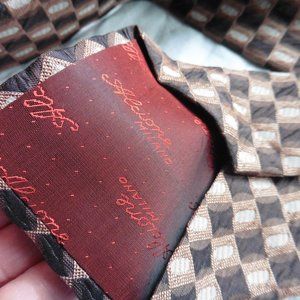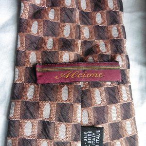 Alcione Milano necktie. Pre-owned in very good condition. 100% Silk. Made in Italy. 59" total length. 4" widest point. Dark brown/light brown checkered pattern.
