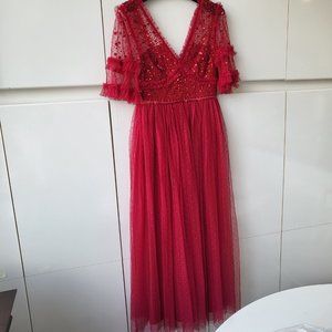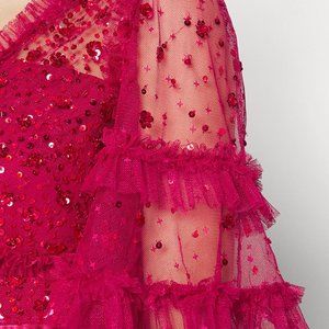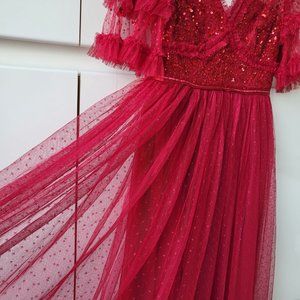 The Maybelle Bodice V-Neck Ankle Gown in Deep Red. The bodice of this gown is decorated with intricate, scattered sequins creating the perfect all-over shimmer. Beautifully adorned with delicate tulle frills for a romantic finish. The skirt is developed from layers of frothy tulle to create an elegant silhouette. A truly magical piece.