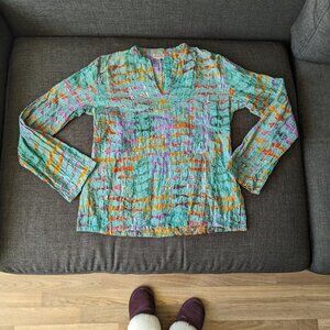 This stunning woven and embroidered pullover blouse from textile designer Neeru Kumar is in very good used condition. No noted rips, holes, stains or areas of excess wear. When looking very closely there are a few areas of the embroidery where a fluff or stray thread is showing some wear. I've included close up photos of the fabric to illustrate what I mean.