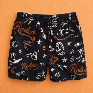 Statement flat front shorts from Negative Space featuring an all over rodeo inspired print with horses, stars, lassos, boots, and western motifs. Black base with white and burnt orange graphics gives them a bold graphic look without feeling costume or novelty.