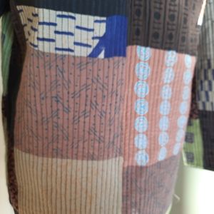 very good condition. Some blocks are not straight but I think it adds to the charm. Due to the size, I assumed this is a woman's jacket. 100% silk. I did handwash, so silk is a little rough now. Small thread seen in last pic