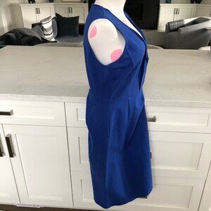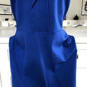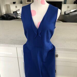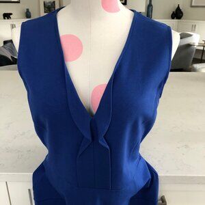 Neiman Marcus Sleeveless Deep V Neck Fit & Flare Rayon Blend Dress w Front Ruffle Detail High Low Hemline in Cobalt Blue