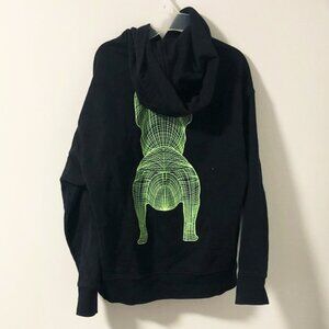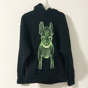 Unique black hoodie from Life Work with standout neon green French bulldog design on a sharp black background. Size small (men's).