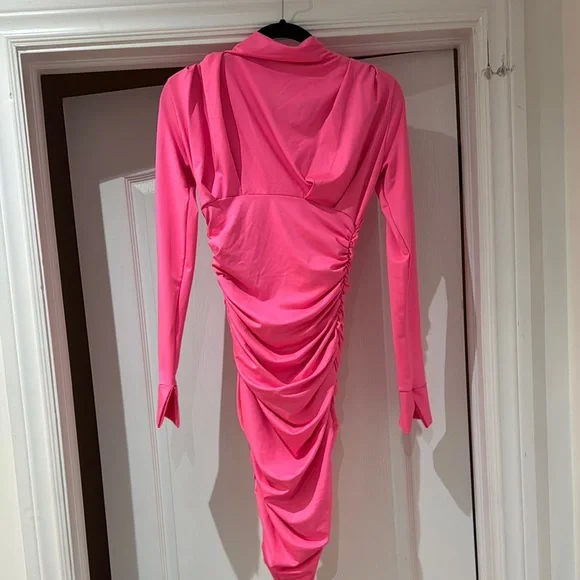 This stunning pink ruched dress is perfect for any occasion. Its elegant design and vibrant color make it a standout piece in any wardrobe. Spandex tight material